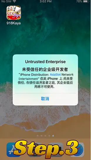 Step 5, press cancel button for the pop up notification about the untrusted developer and go to setting.