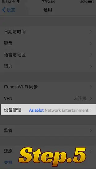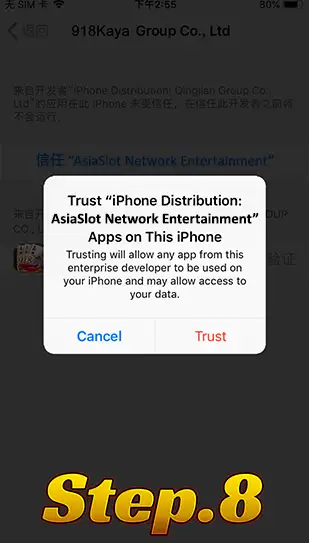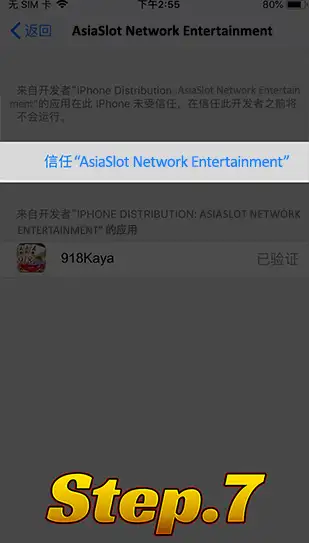 Step 8, select device management then select the corresponding enterprise applicaton (AsiaSlot Network Entertainment). In the last step, choose trust and enter to the download section.