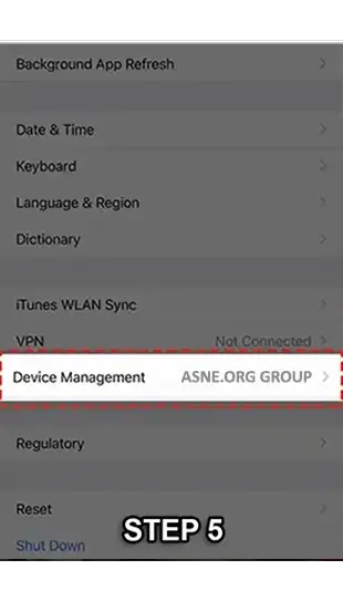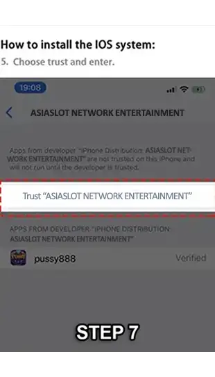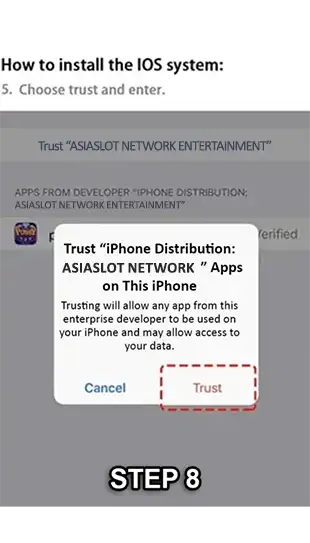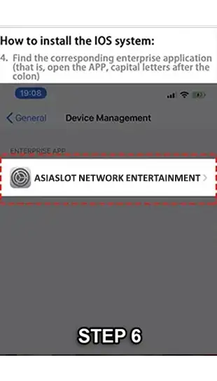 Step 8, select device management then select the corresponding enterprise applicaton (AsiaSlot Network Entertainment). In the last step, choose trust and enter to the download section.